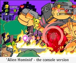 Tom has gone offline and into the platform gaming world. Capitalizing on the popularity of ‘Alien Hominid,’ the side-scrolling Flash game, The Behemoth was formed. The newly formed venture would soon shock the gaming world by launching a multi-platform title that wasn’t 3D. They took a Flash game that was originally hosted on Newgrounds.com, and turned it into a 2D, multi-level side-scrolling shooter. One could equate this to releasing a black & white, silent movie in today’s market and expecting big box office results. But results are exactly what The Behomoth gang received. After being crowned the winner in the The Biggest Suprise category at the 2004 IGN Awards, ‘Alien Hominid’ went on to take the Audience Award at the Independence Game Awards earlier this year. Many other nominations and awards followed, and this success helped The Behemoth gang extend their title to other platforms. As of today, ‘Alien Hominid’ is currently available for Playstation 2, Gamecube, and more recently Game Boy Advanced. Not bad for a Flash web game.